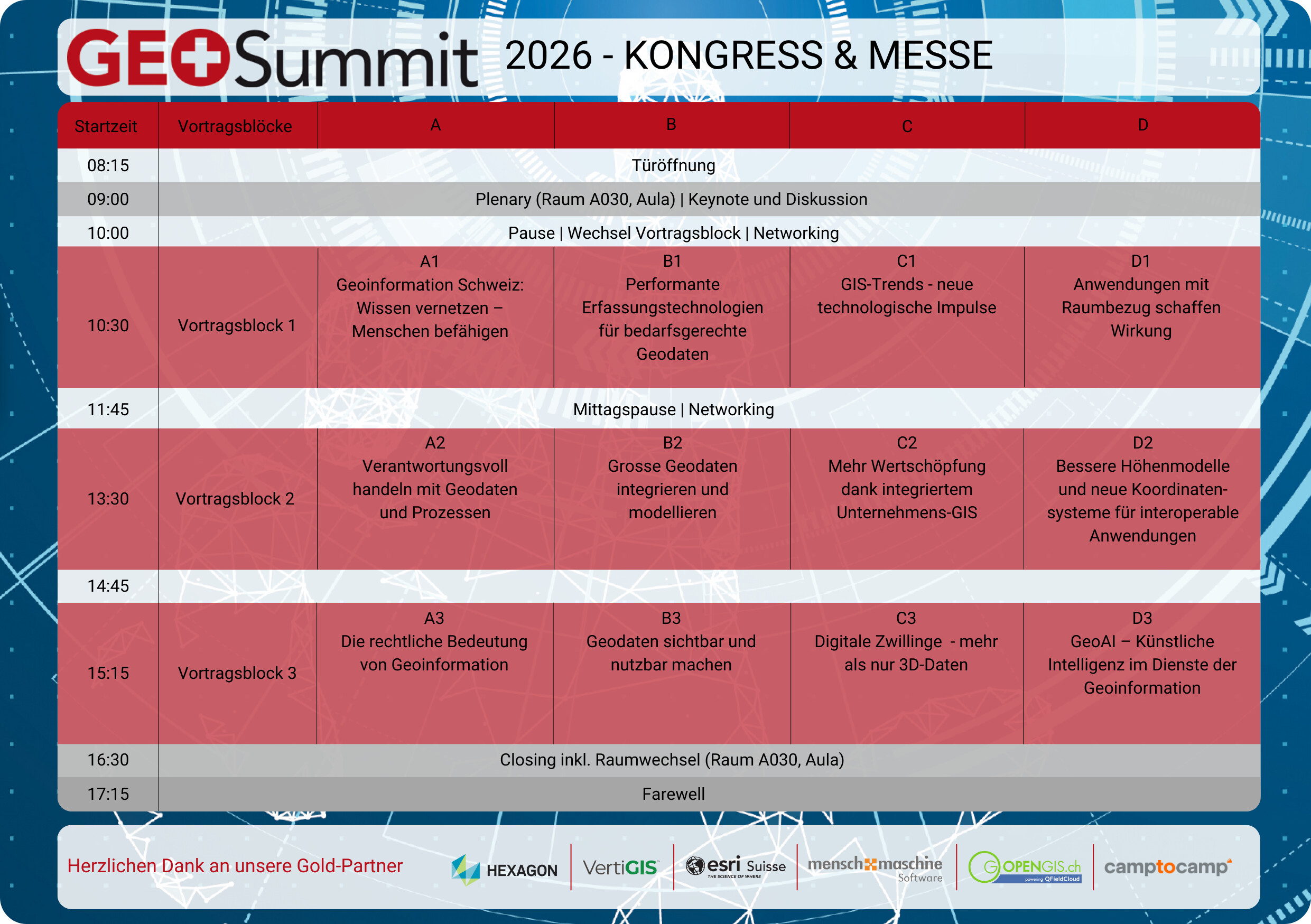 In einer Welt, die sich stetig wandelt, gewinnen Fragen nach der nachhaltigen Gestaltung unserer Lebensräume zunehmend an Bedeutung. Unter dem Leitgedanken „Raum und Zeit neu denken – Geoinformationen für heute und morgen» laden wir Sie ein, neue Perspektiven zu entdecken, bewährtes Wissen weiterzudenken und gemeinsam Lösungen für die Herausforderungen von morgen zu entwickeln.