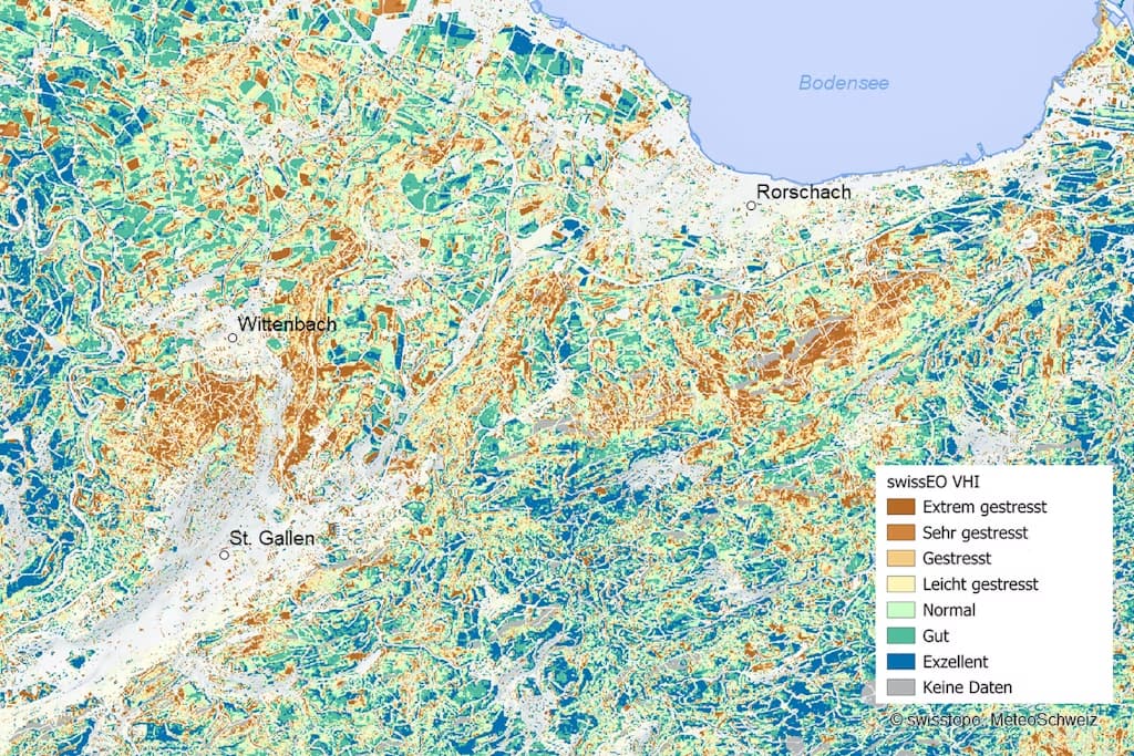 Die Daten: swissEO S2-SR (Sentinel-2 Surface Reflectance) und swissEO VHI (Vegetation Health Index).